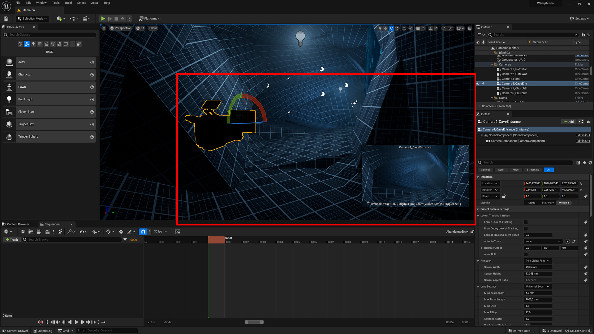 This level put emphasis on the layout and terrain navigation as well as the atmosphere. To keep better control of the layout and framing I placed, throughout the level several, camera actor that would serve as reference shot to work on my composition.